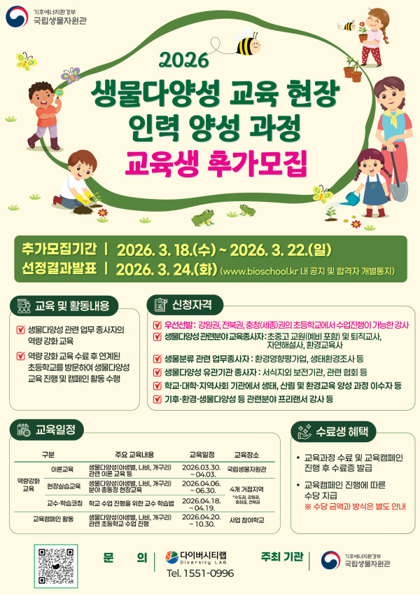 - 2026년도추가 모집 생물다양성 교육 현장 인력 양성과정 교육생 추가 모집_공고문 및 신청서.hwp (5.2M) 6회 다운로드 | DATE : 2026-03-20 13:43:59