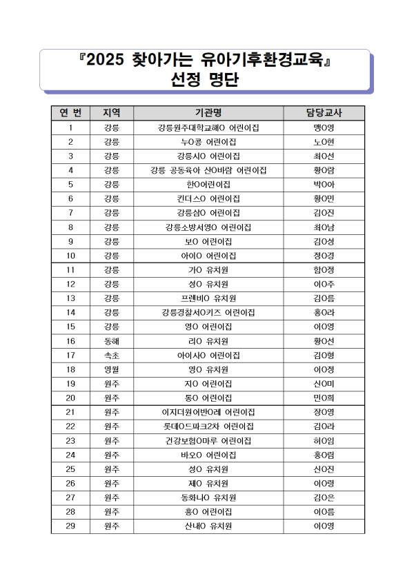- 『2025 찾아가는 유아기후환경 프로그램』 기관 선정 명단.hwp (108.5K) 9회 다운로드 | DATE : 2025-10-29 14:59:41