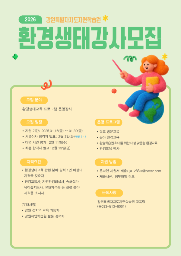 공지사항 강원특별자치도자연학습원 환경생태교육 강사모집