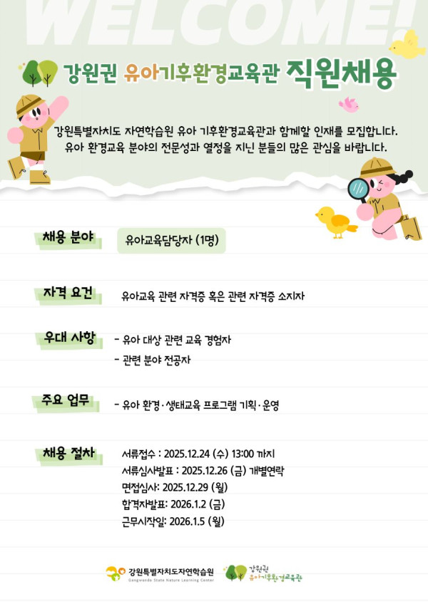 채용정보 [유아기후환경교육관] 교육팀 직원 채용 공고 (유아환경교육담당) 페이지 정보 작성자 자연학습원 댓글 0건 조회 371회 작성일 25-12-10 10:38 본문 강원자연학습원 유아기후환경교육관에서 유아환경교육분야의 전문성과 역량을 갖춘 직원을 공개 채용하오니 많은 관심과 지원바랍니다.자세한 내용은 붙임문서를 확인해 주시기 바랍니다.감사합니다. 첨부파일 [공고2025-22] 강원특별자치도자연학습원 직원 채용공고_ 유아기후환경교육관.hwp (319.5K) 78회 다운로드 | DATE : 2025-12-10 10:38:44 목록 이전글[유아기후환경교육관] 유아환경교육 담당 채용결과안내 26.01.06 다음글직원채용 최종합격자 발표 25.12.06 댓글목록 댓글목록 등록된 댓글이 없습니다.